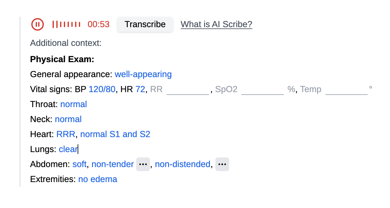 Try vocal commands for exams: You can try saying "Vitals, heart, lungs, abdomen normal" and the AI will attempt to write an normal physical exam based on the normal systems you mentioned. Abnormal findings you describe in the recording should also be generated.