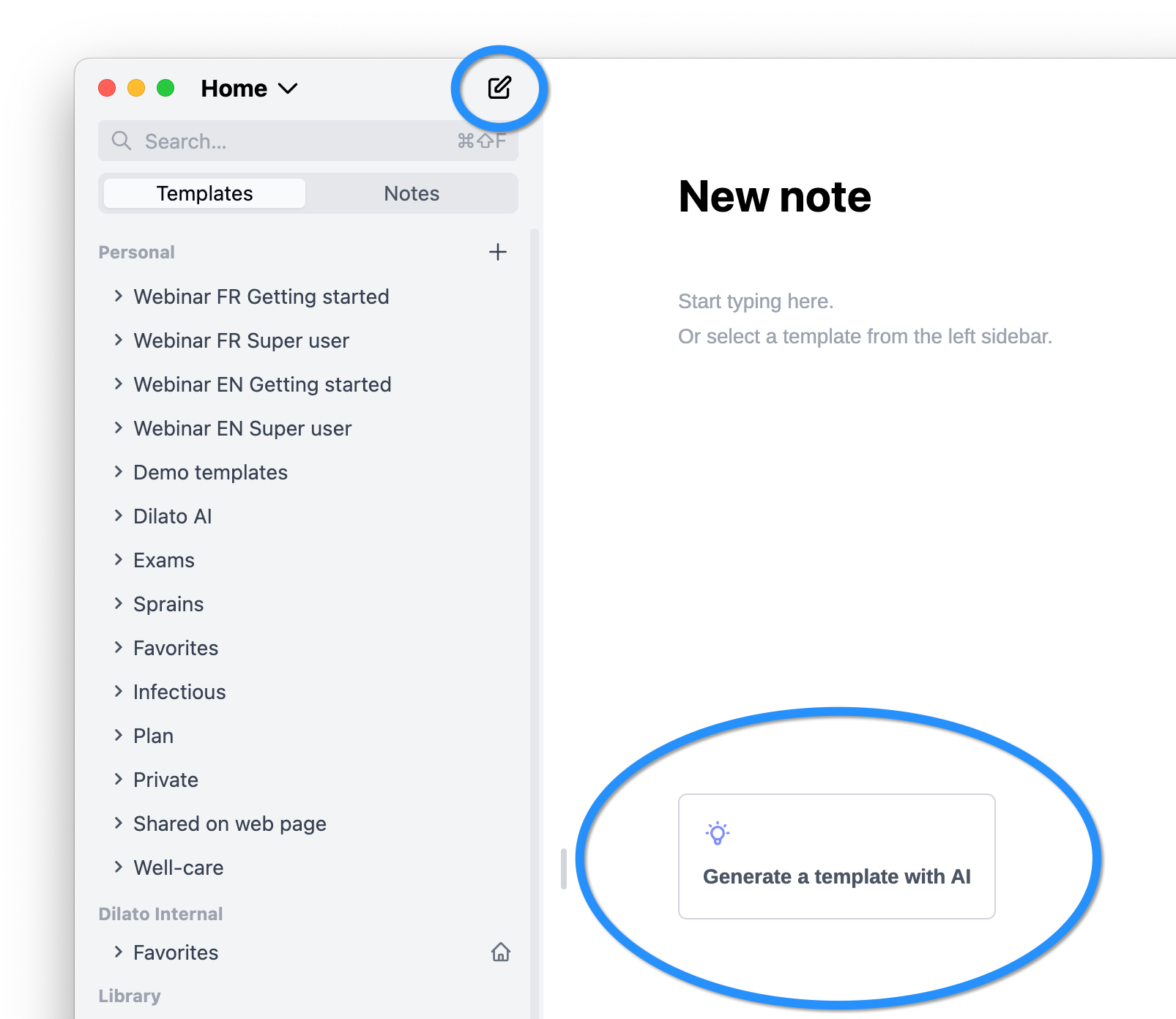 The Template Generator is an AI tool in Dilato to help you create templates. You can save these templates for later or create them on the fly during patient visits.