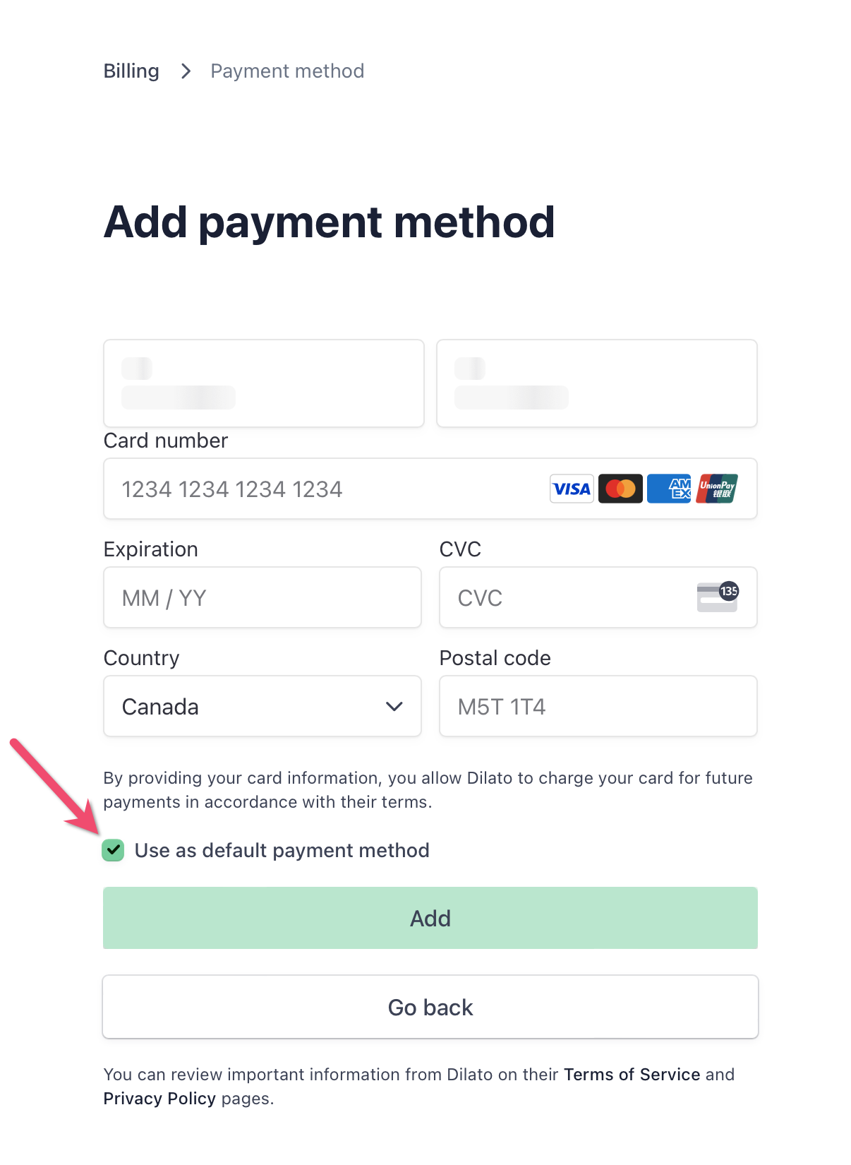 Enter your new credit card information, check the "Use as default payment method" box, and press "Add."